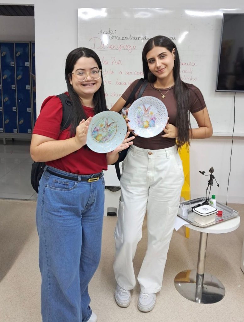A Oficina de Decoupage em Pratos para Iniciantes, realizada pelo Centro Universitário Cesmac, proporcionou aos participantes uma imersão na técnica artesanal de decoração por meio da colagem de recortes em superfícies. Utilizando pratos como base, a atividade apresentou, de forma acessível e prática, os principais conceitos da decoupage, com temática especial de Páscoa, explorando elementos como coelhos, flores e ovos decorativos.