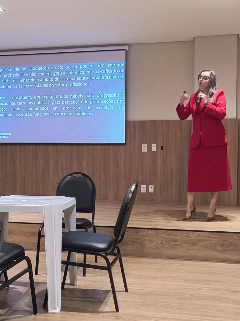 No período da tarde, foi realizado o segundo workshop, conduzido pelas professoras Juliana Pereira e Karina Barbosa Franco, com foco nas novas regulamentações da Pós-Graduação lato sensu, conforme o disposto no Parecer nº 637/2025 do Conselho Nacional de Educação (CNE). As discussões apresentadas resultaram de um acompanhamento contínuo iniciado no segundo semestre de 2025, incluindo a participação de representantes da Especialização lato sensu em reunião promovida pela Associação Brasileira das Mantenedoras do Ensino Superior (ABMES), em Brasília/DF.