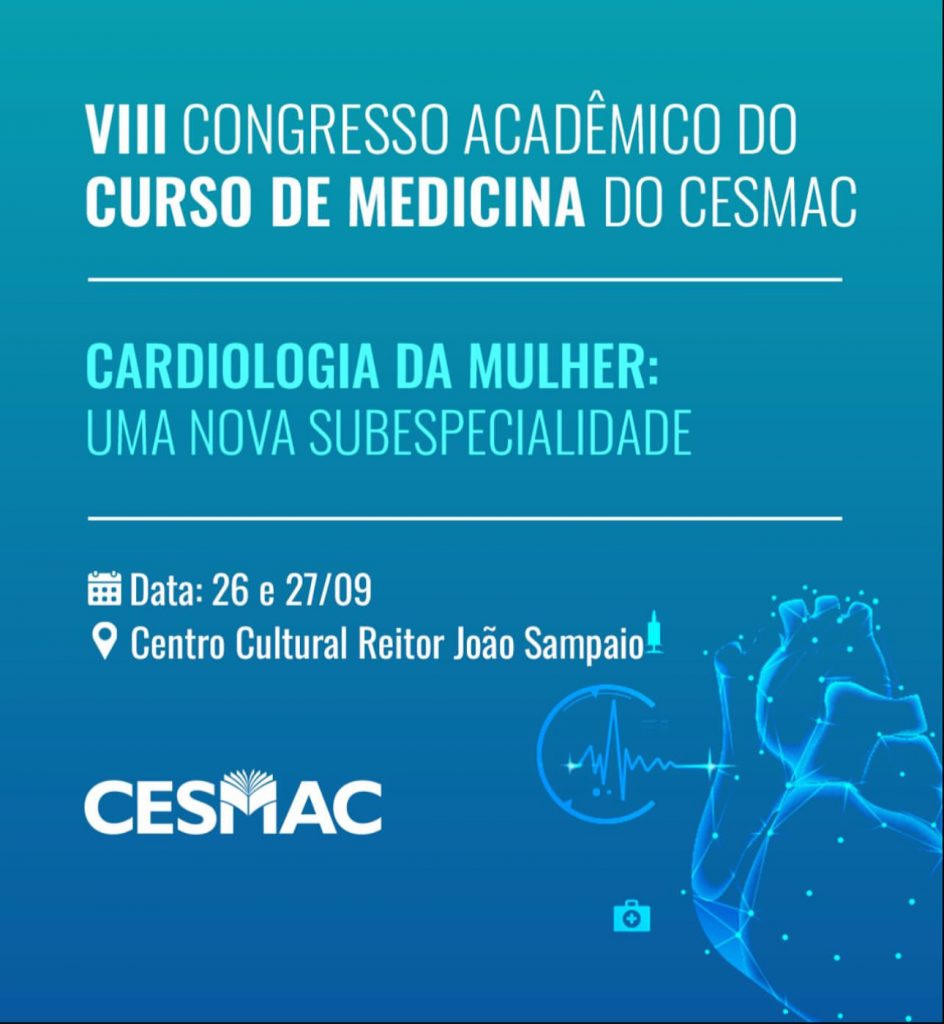Nos dias 26 e 27 de setembro, o Cesmac realiza o VIII Congresso Acadêmico do Curso de Medicina, que este ano traz como tema central “Cardiologia da Mulher: uma nova subespecialidade”. O evento será realizado no Centro Cultural Reitor João Sampaio e é aberto não apenas aos estudantes da instituição, mas também a profissionais e interessados da área da saúde em geral.
