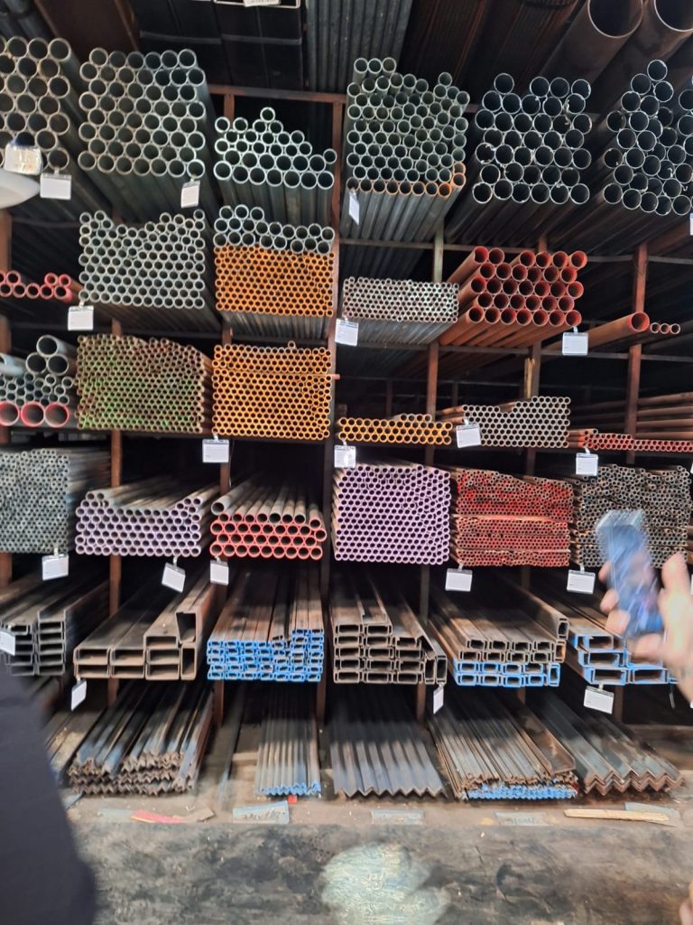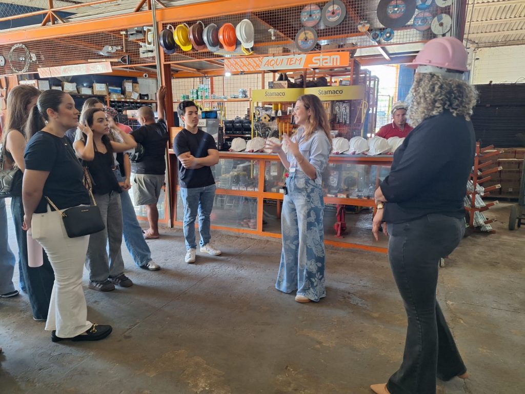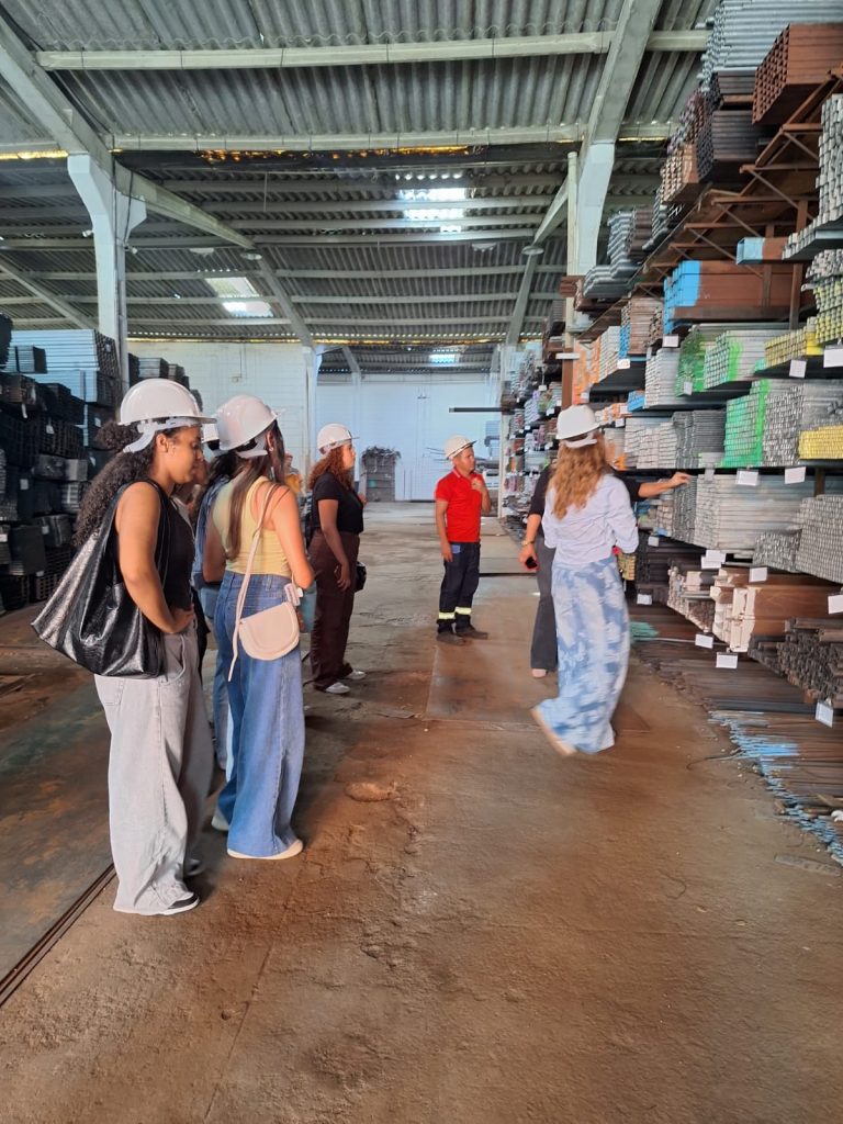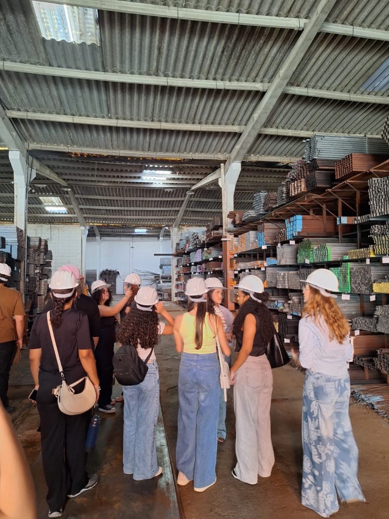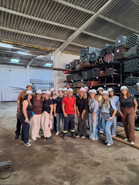Ao longo da visita, a turma teve a oportunidade de conhecer a diversidade de aplicações do aço, além de outros materiais como telhas, ferro, chapas metálicas e estruturas pré-montadas, utilizadas na execução de colunas e demais elementos estruturais. Também foram apresentados os diferentes tipos de metalon — tubos de aço carbono com seções quadradas, retangulares ou redondas — amplamente utilizados em projetos arquitetônicos e estruturais.
