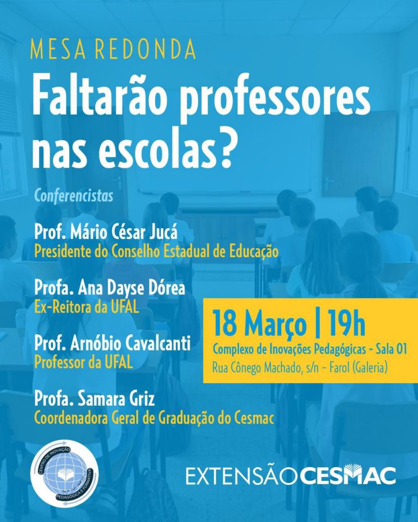 A mesa-redonda contará com a participação de nomes reconhecidos na área educacional. Entre os conferencistas estão o professor Mário César Jucá, presidente do Conselho Estadual de Educação; a professora Ana Dayse Dórea, ex-reitora da Universidade Federal de Alagoas; o professor Arnóbio Cavalcanti, docente da mesma instituição; e a professora Samara Griz, coordenadora geral de graduação do CESMAC.